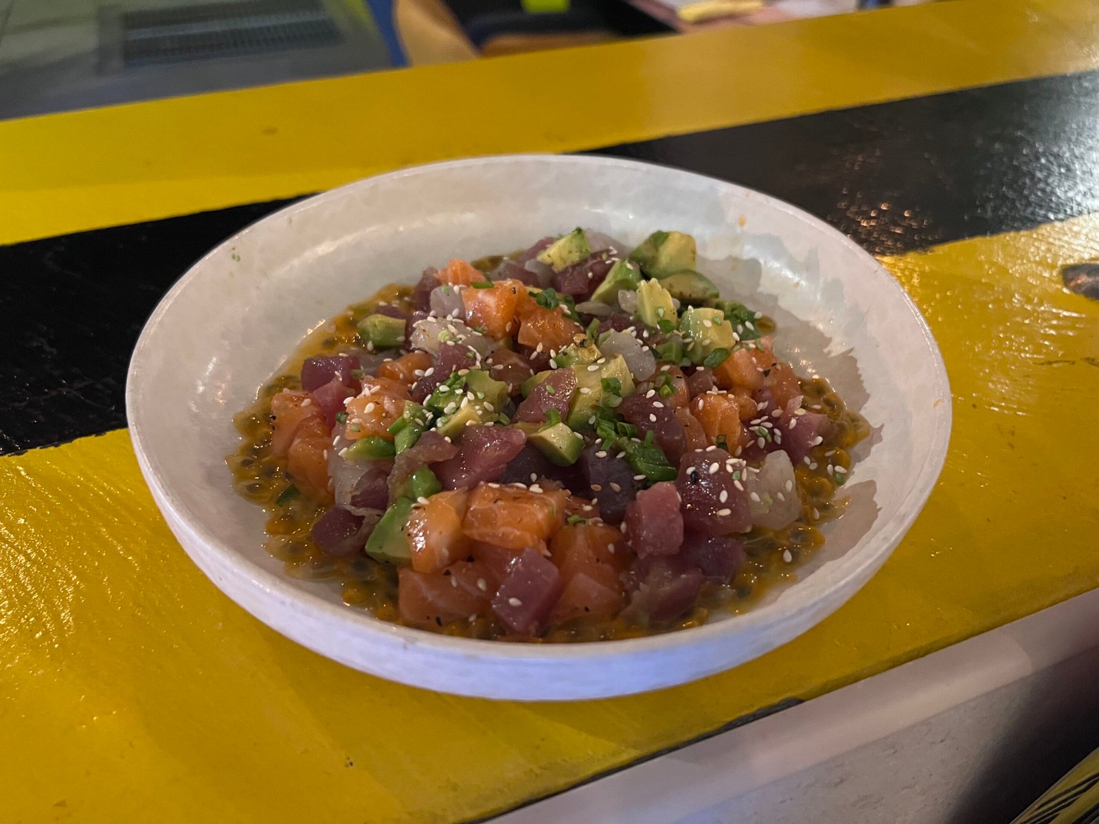 Mix of fish, citrus sauce based passionfruit, onion, avocado, roe