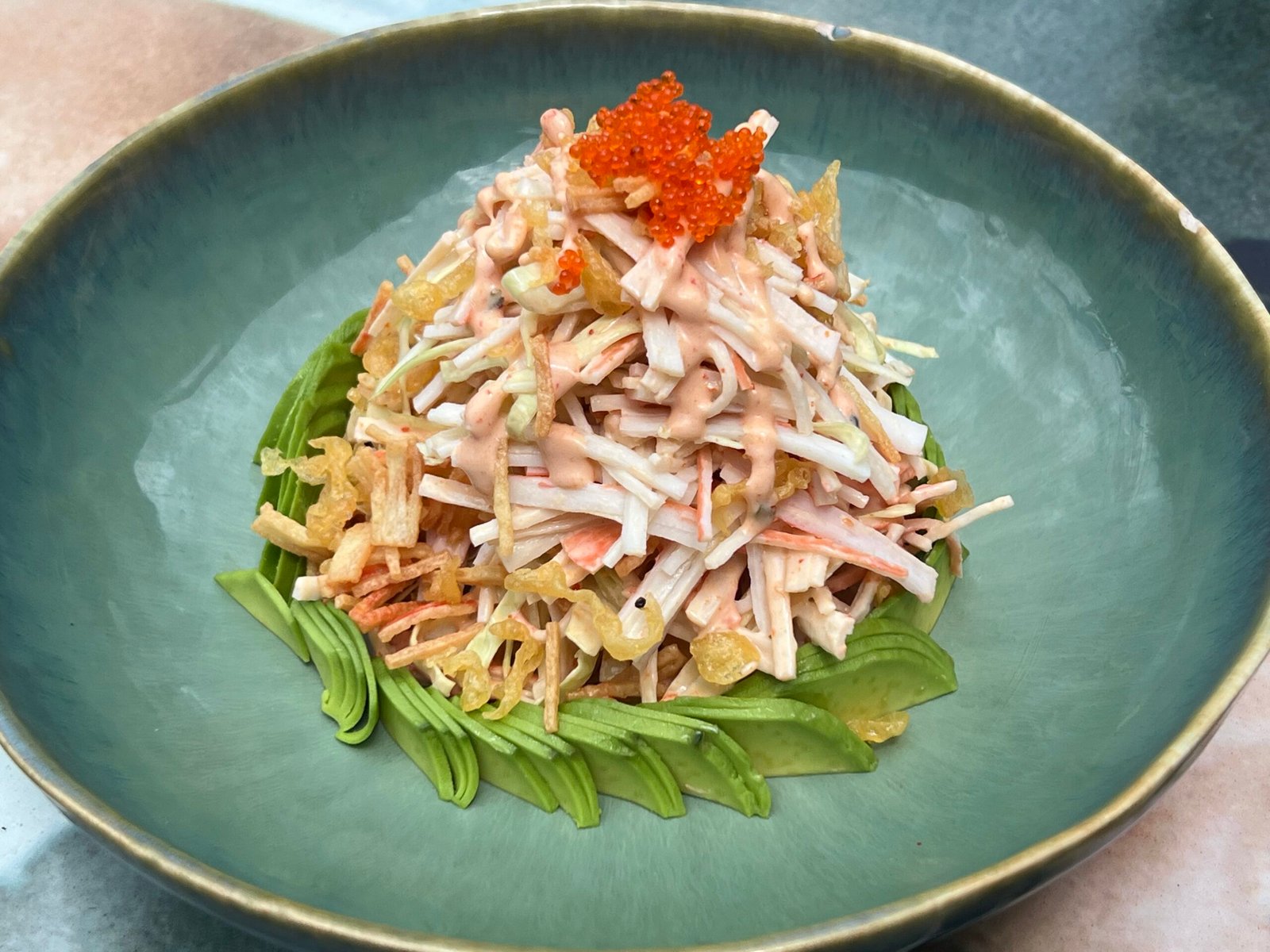 Avocado, crab stick, cucumber, gabage, egg, fried oignons