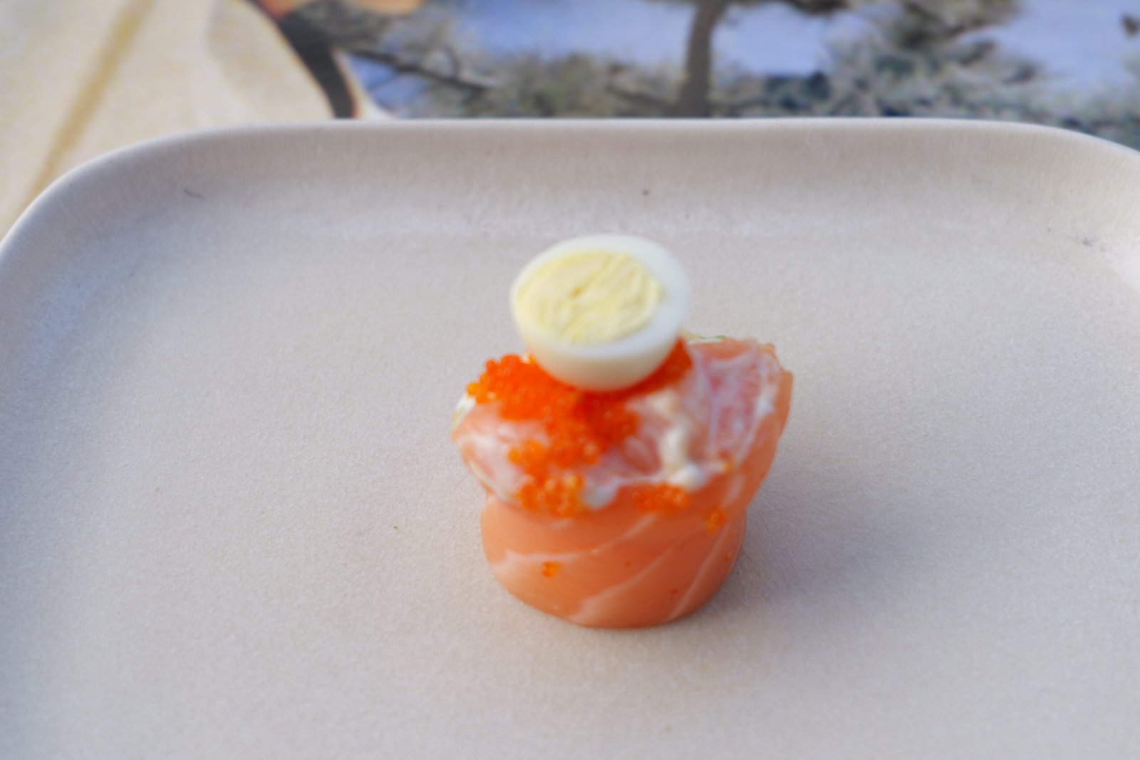 Salmon, cheese, salmon tartar, quail egg