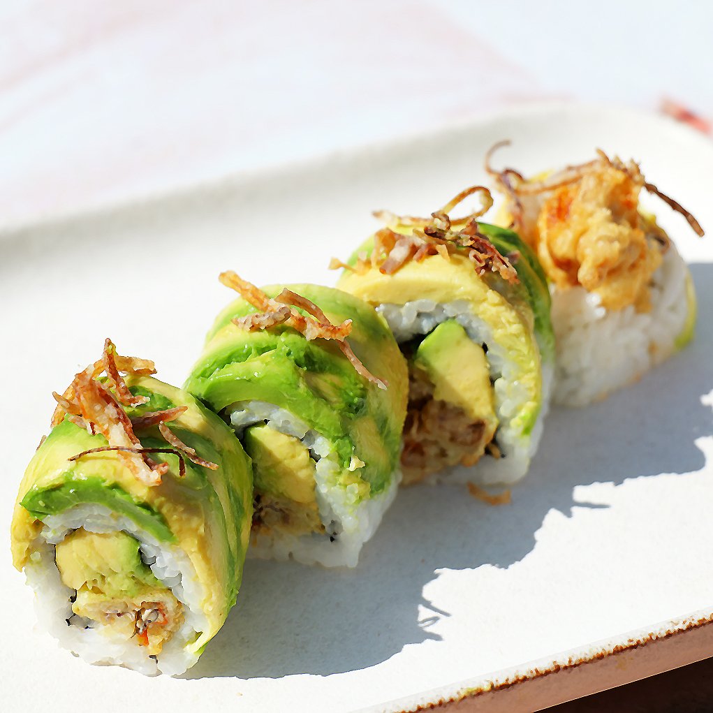 Crab, wasabi sauce, avocado, leed, millet, cress