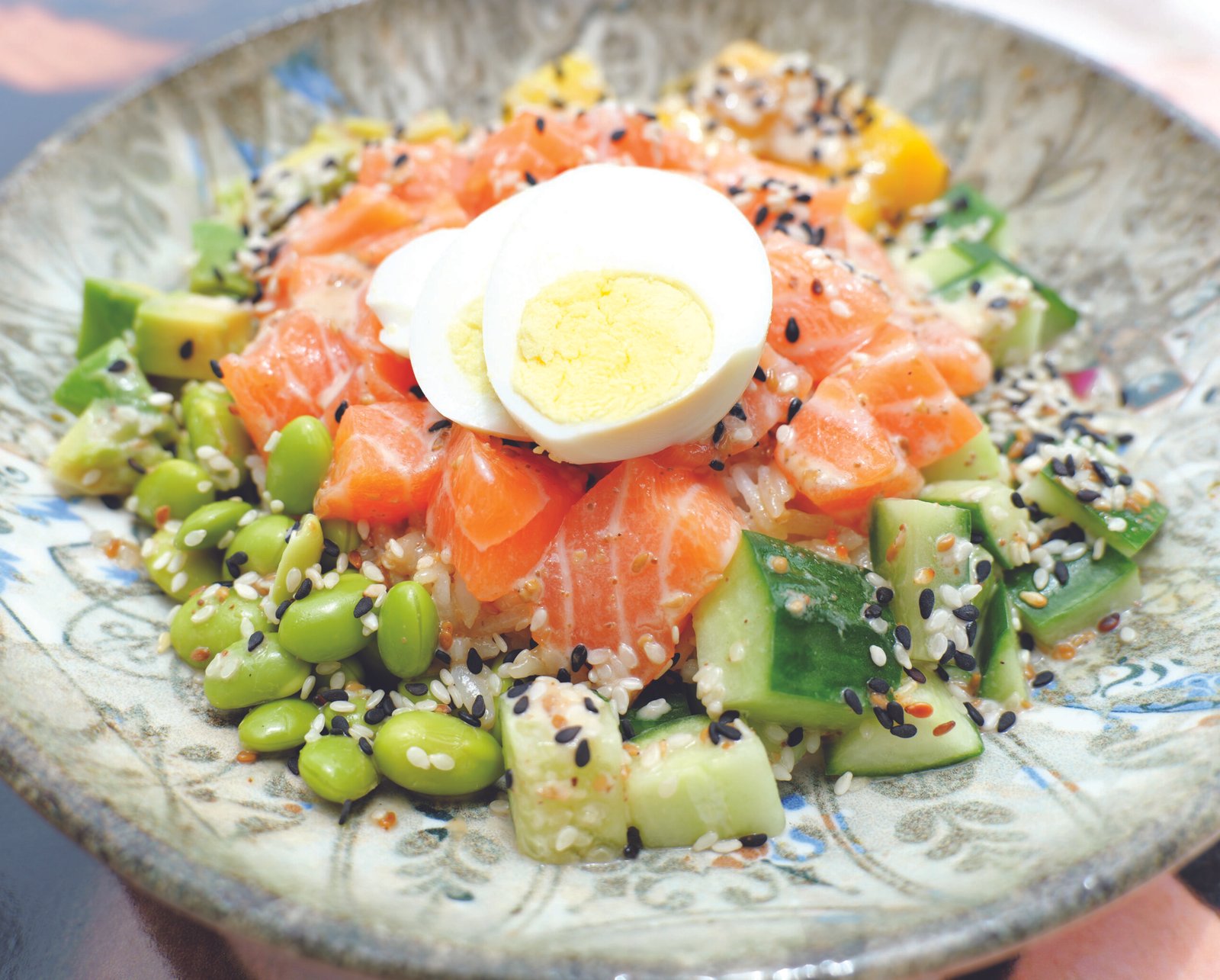 Salmon, avocado, cucumber, rice, beans, mango, sesame